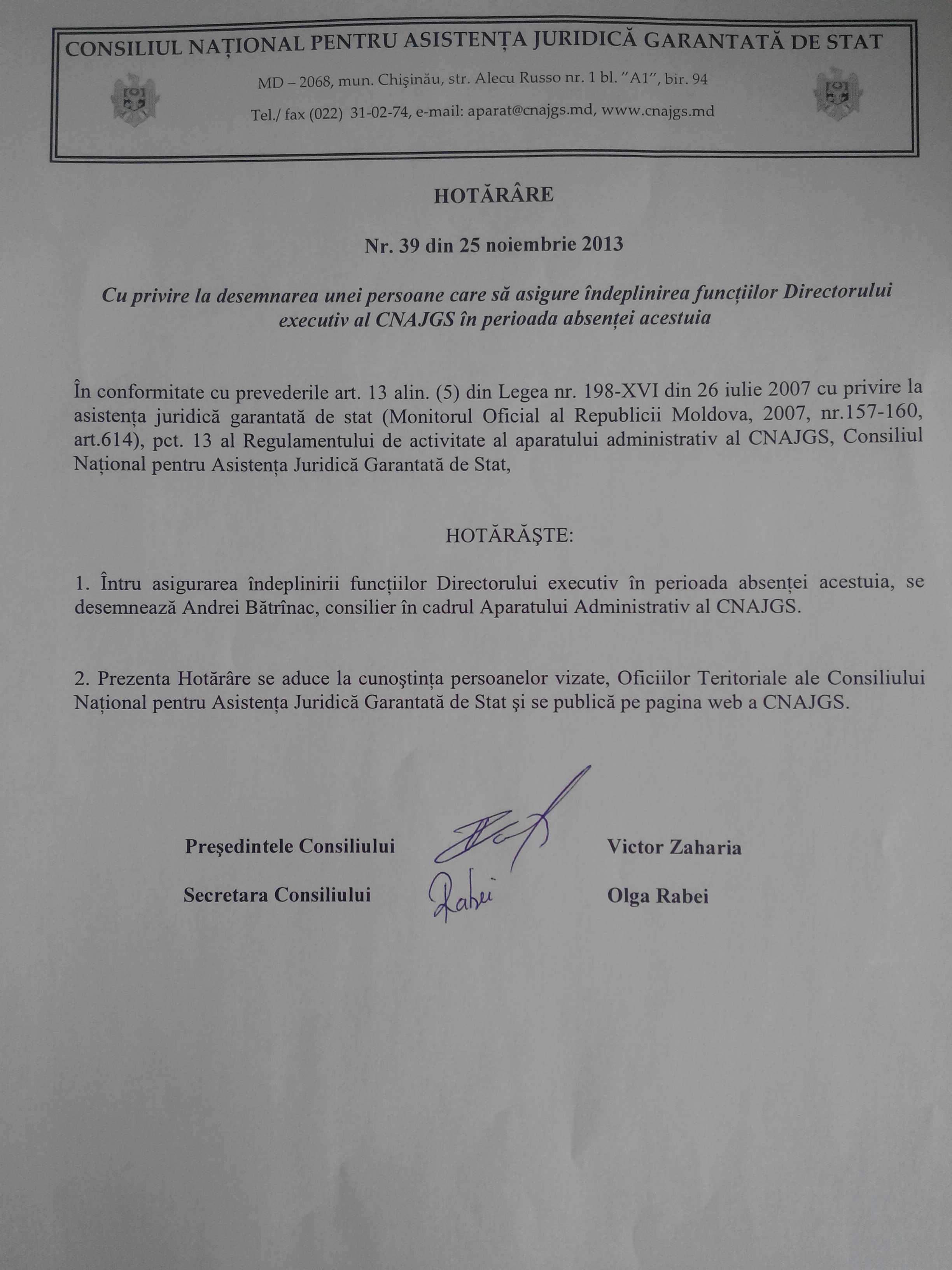 - Hotărârea nr. 39 din 25.11.2013 (Cu privire la desemnarea unei persoane care să asigure îndeplinirea funcţiilor Directorului executiv al CNAJGS în perioada absenţei acestuia