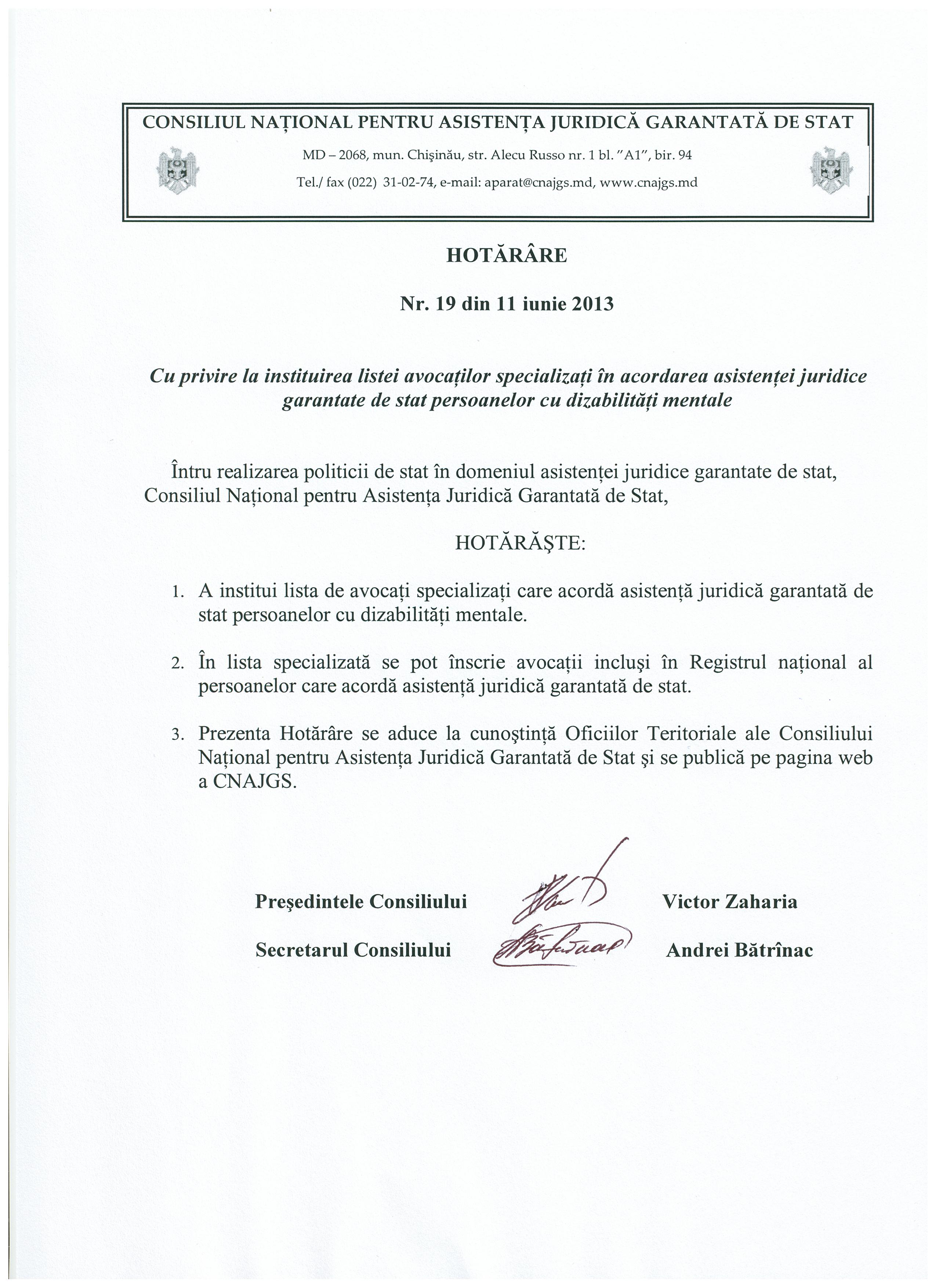 - Hotărârea nr. 19 din 11.06.2013 (instituirea listei avocaţilor specializaţi în acordarea ajgs persoanelor cu dizabilităţi mintale)