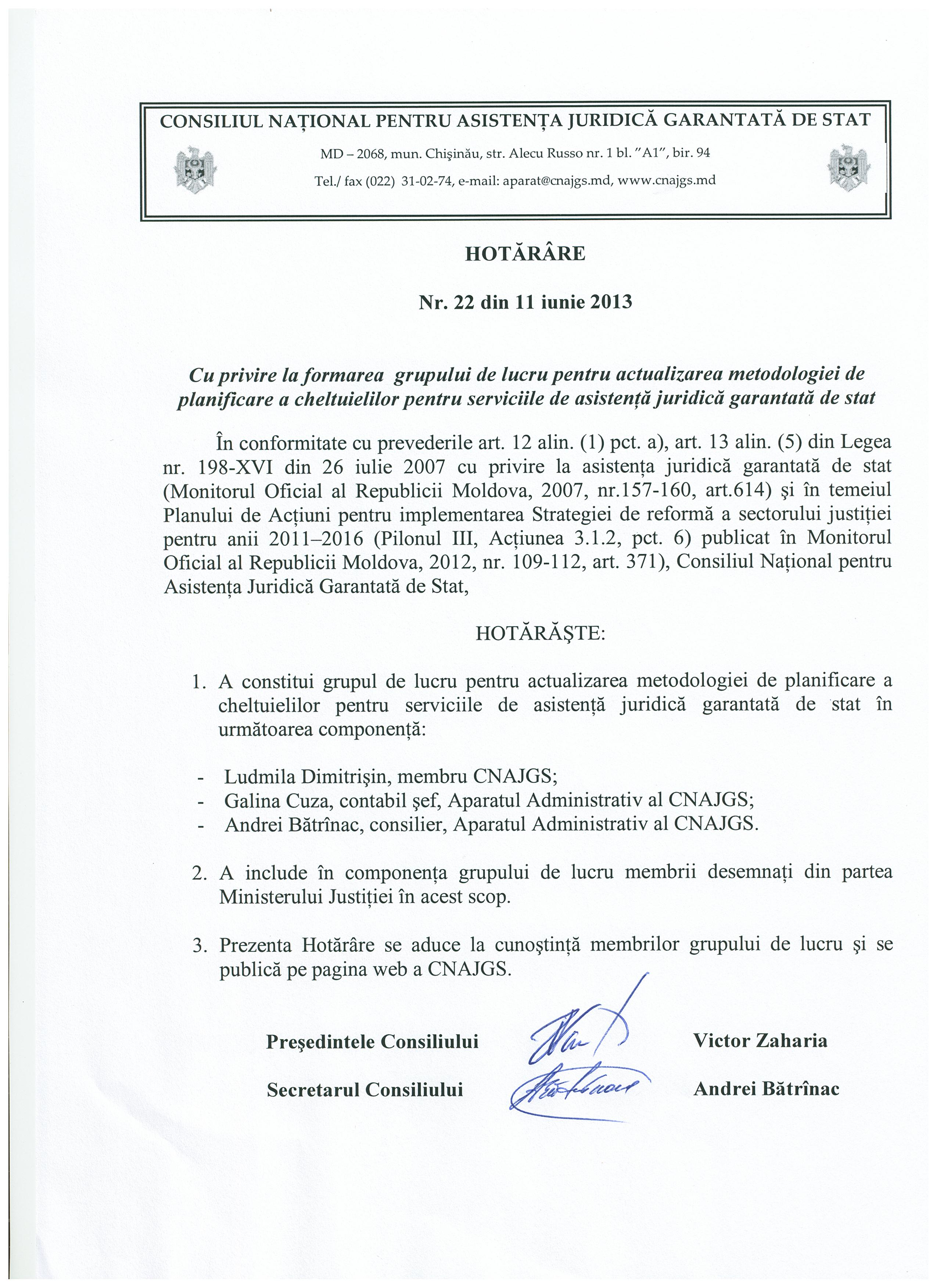 - Hotărârea nr. 22 din 11.06.2013 (formarea grupului de lucru pt actualizarea metodologiei de planificare a cheltuielilor pt serviciile de ajgs )